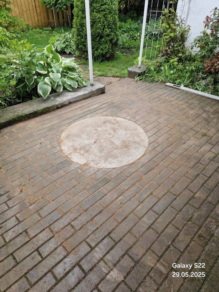 Uue kaevukaane paigaldamine, mis on sujuvalt integreeritud olemasolevasse tellissillutisega patiosse. Ümmargune kaas asetseb ümbritsevate sillutiskividega tasa, tagades puhta juurdepääsu säilitades sillutise esteetika. Professionaalne viimistlustöö.