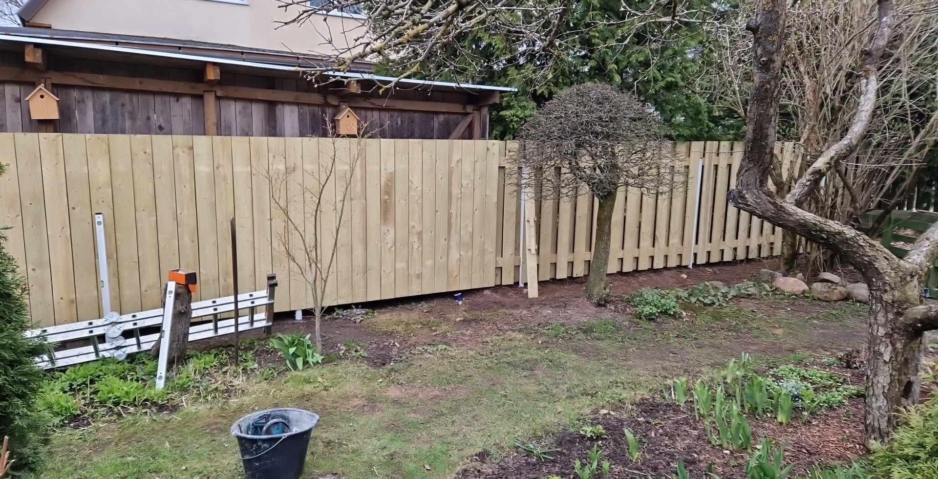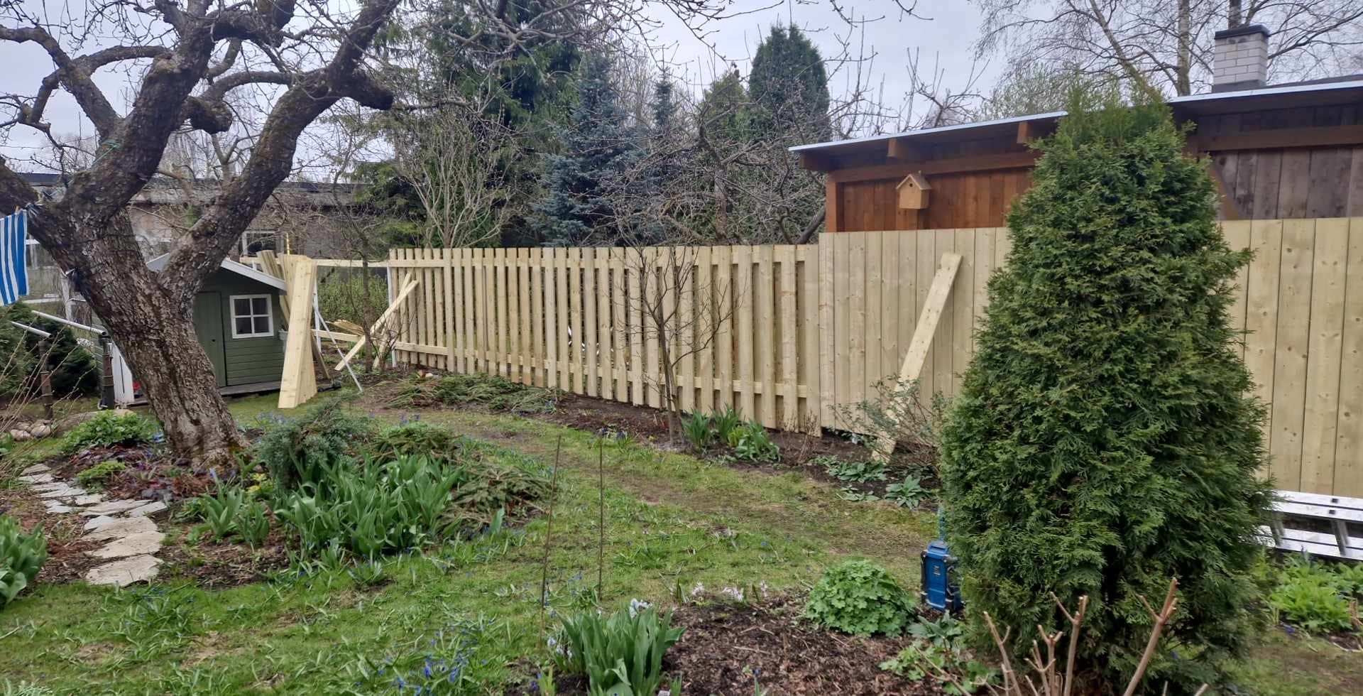 Täielik piirdeaia paigaldus elamukrundile Supilinna ajaloolises linnaosas Tartus. Tööd hõlmasid vana aia eemaldamist, uue vertikaalse täislaudaia (privaatsusstiil) paigaldamist tänava poolsele küljele ning vahega lippaiaosa paigaldamist aia/tagahoovi piiril. Postid kinnitatud betoonalusele kruusaalusega. Aed kulgeb mööda mitut krundipiiri, sealhulgas pikemat tänavapoolset lõiku. Krundil asub viljapuudega küps aed ja aiamaja.
