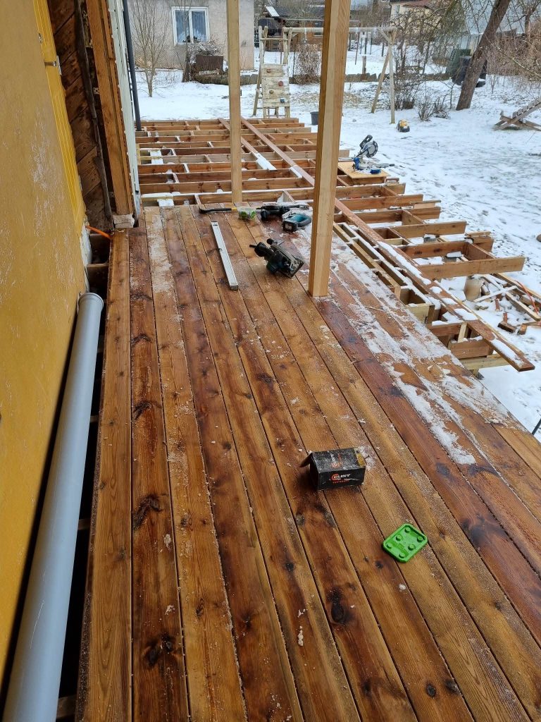 Veerikul rajasime uue terrassi, mille ehitust alustasime tugeva karkassi paigaldamisega. Postid olid eelnevalt betoneeritud, mis võimaldas meil keskenduda kandekonstruktsiooni täpsele ja vastupidavale ehitamisele.