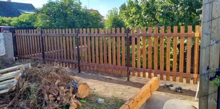Uue puitlippia ehitamine elamukrundile Viljandis. Aed on valmistatud immutatud/töödeldud puidust tumepruuni viimistlusega, vahega vertikaallippidega horisontaalsetel lattidel ja metallpostitugedel. Tööd hõlmasid ala puhastamist, postide paigaldamist ja aiapaneelide kokkupanemist. Teine lõik näitab kõrgemat aeda betoonalusvööga kallaku tasandamiseks.