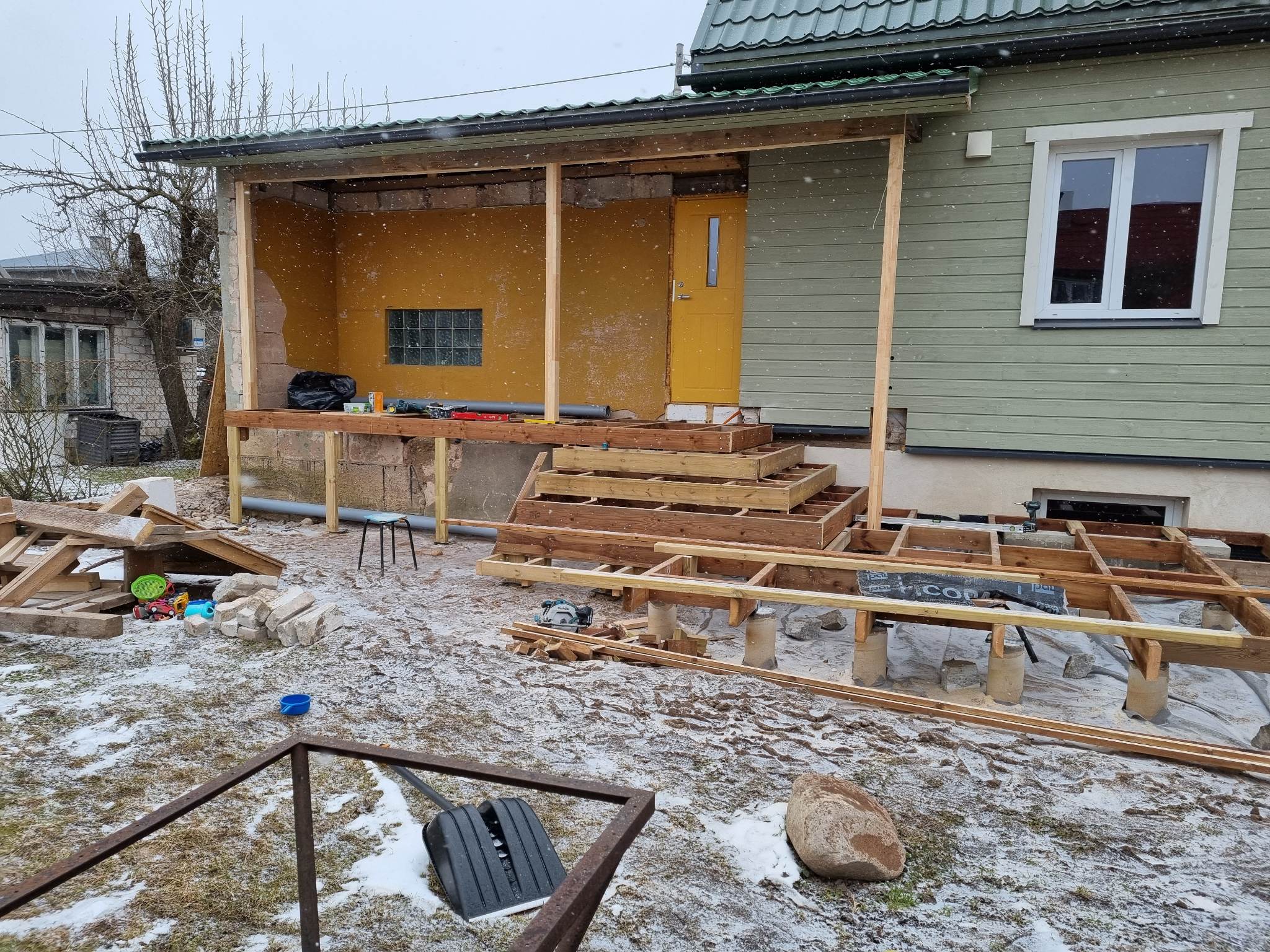 Veerikul rajasime uue terrassi, mille ehitust alustasime tugeva karkassi paigaldamisega. Postid olid eelnevalt betoneeritud, mis võimaldas meil keskenduda kandekonstruktsiooni täpsele ja vastupidavale ehitamisele.
