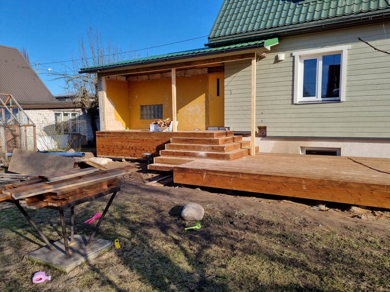 Projekt hõlmas mitmeid treppe ja sopistusi, mistõttu nõudis terrassiehitus hoolikat mõõtmist ja detailset teostust. Vaatamata sellele, et ilm polnud enam suviselt soe, valmis karkass õigeaegselt ning paigaldasime ka terrassilauad.