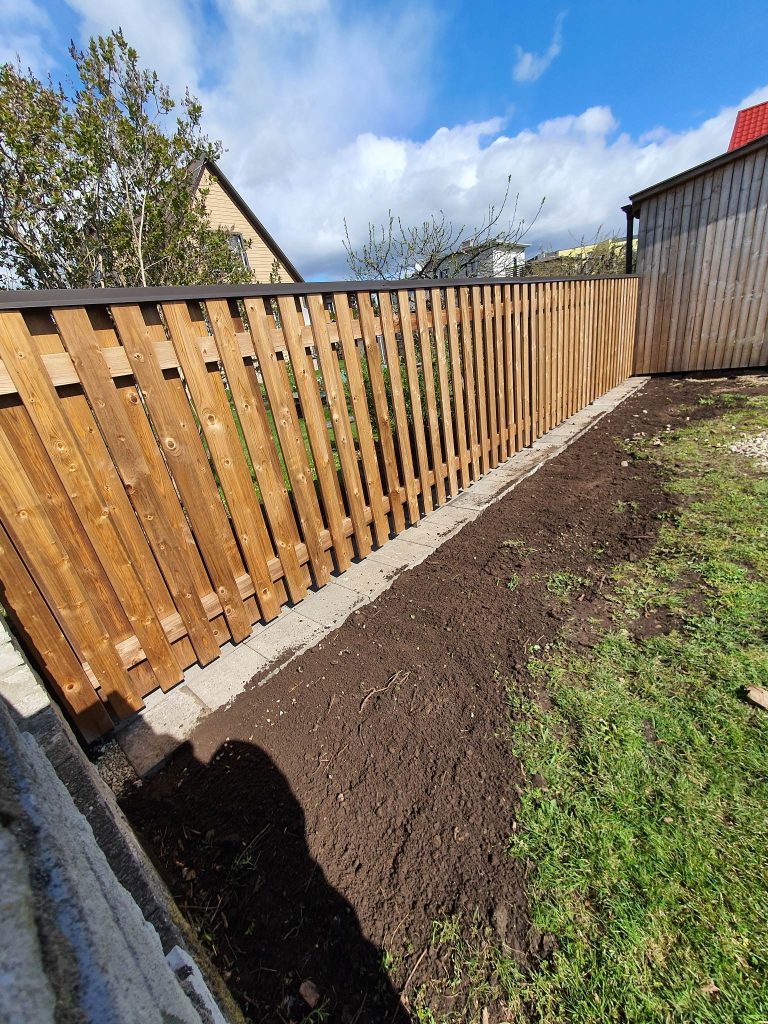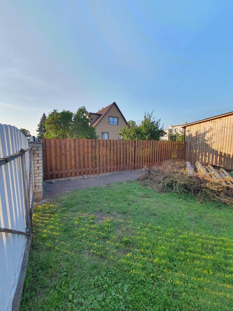 Uue puitlippia ehitamine elamukrundile Viljandis. Aed on valmistatud immutatud/töödeldud puidust tumepruuni viimistlusega, vahega vertikaallippidega horisontaalsetel lattidel ja metallpostitugedel. Tööd hõlmasid ala puhastamist, postide paigaldamist ja aiapaneelide kokkupanemist. Teine lõik näitab kõrgemat aeda betoonalusvööga kallaku tasandamiseks.